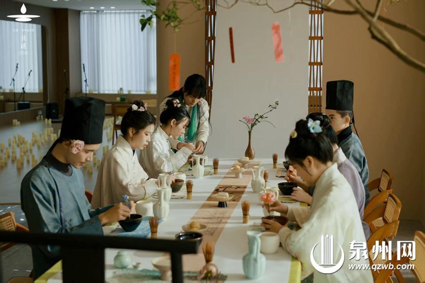 以闽南老建筑为载体的梧林古村落,同样有几处舒适自在的美学茶事生活空间。怀纪茶局为游客们提供体验汉服换装和宋代点茶项目。配上茶点,听一曲南音,重现千年饮茶方式。来自上海的游客刘小姐刚体验完宋式点茶,她告诉记者:“泉州这座世遗之城,保留很多宋元文化,点茶真的是旅游中的难忘体验。”