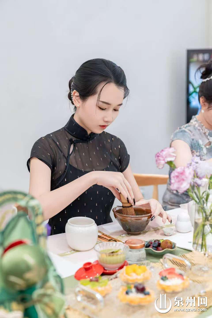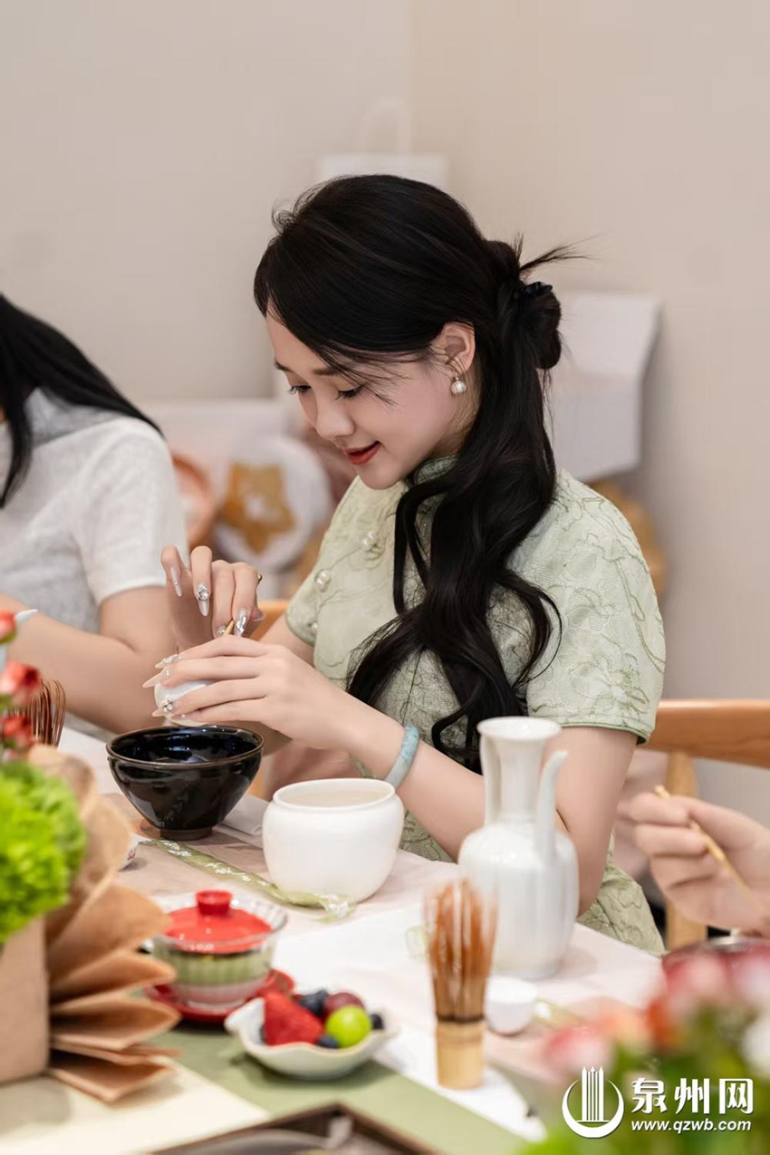 2016年,泉州人蔡晶晶在一次机缘巧合下,开启了茶修之旅。她慢慢把宋代点茶带进泉州,还原宋代泉州时的饮茶之风。后来,她在晋江安海镇三里街开设茶室,宋式点茶是开启她每日慢生活的仪式。她轻轻地在茶盏中放茶末,缓缓注入沸水调膏成细腻糊状,边注水边用茶筅快速击拂,多次点汤击拂,使茶汤泛起丰富泡沫,再细细品味。